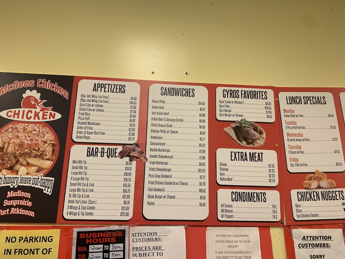 Welcome to McGee's Chicken, a hidden gem located at 2702 E Washington Ave, Madison. This take-out haven specializes in vibrant flavors and hearty portions that keep patrons coming back for more. The star of the show is undoubtedly the chicken—crispy, juicy, and delightfully seasoned. Reviews commend their gizzards and wings, which come alive with the signature mild sauce, delivering a taste reminiscent of Chicago's famed eateries.